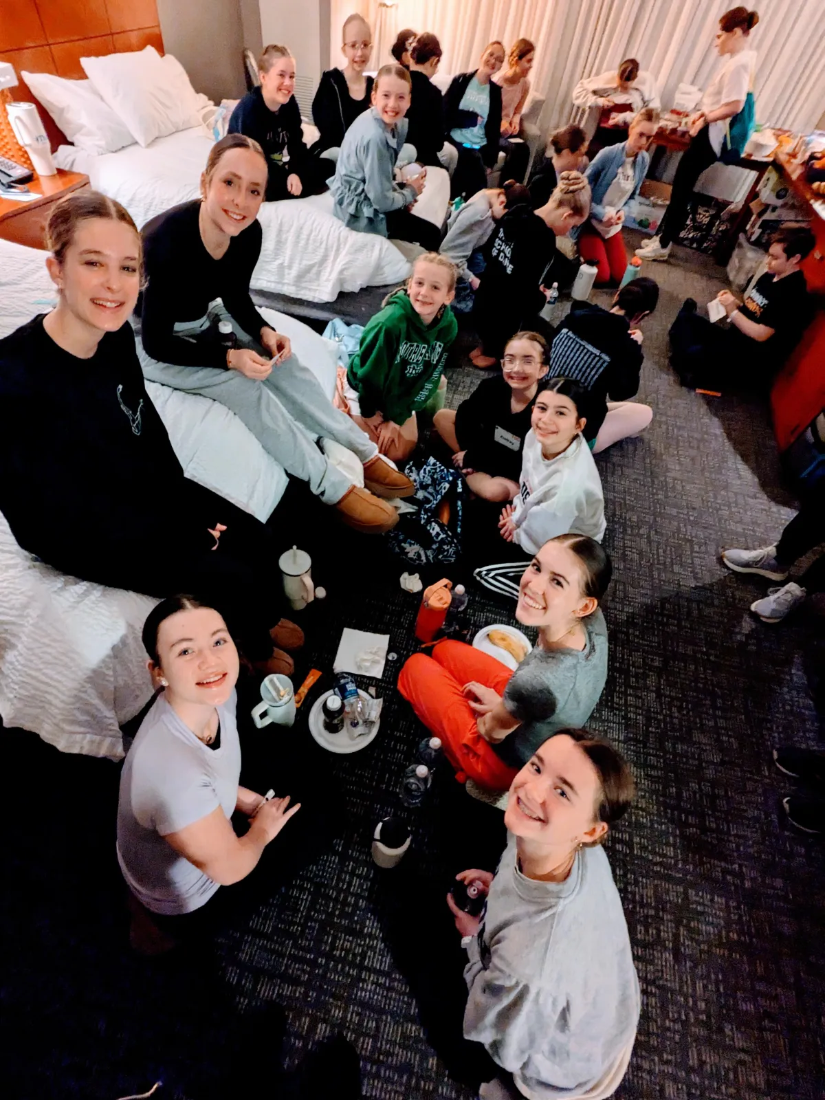 Each group of 3–4 dancers is paired with a volunteer room mom who stays with them in the hotel room, helps with meals, and keeps tabs on their schedule all weekend. Thrive staff is also onsite throughout the weekend and in every dance room.